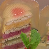 - Em aros (6,5cm de diâmetro), untados com óleo e embrulhados em papel laminado, coloque os mini pavês e preencha com a metade da gelatina (reservada acima)