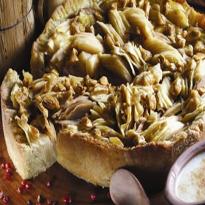 - Com o suco da infusão das maças/pêras fazer uma redução para apurar os sabores. Aquecer em fogo baixo e com um mixer ir colocando um fio do mesmo azeite até obter uma emulsão. Colocar no fundo do prato esse molho, uma fatia da torta e polvilhar com amêndoas torradas caramelizadas.