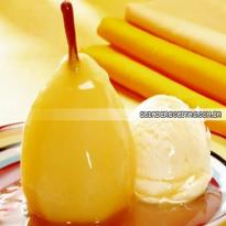 - Coloque as peras no prato de servir com a bola de sorvete ao lado, cubra com a calda e sirva