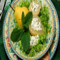 - Dividir pelo número de pratos, as metades de pera contidas em 1/2 lata(s) de pera(s) em calda (01 metade em cada prato) e recheá-las com a mistura da ricota e hortelã