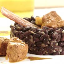 - molde o feijão em um aro (5 cm de diâmetro) nos pratos, coloque a carne e o crisp de bacon