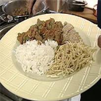 - Sirva os pratos combinando o picadinho de carne, a farofa, o arroz branco e a batata palha