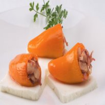 - Corte o fundo dos pimentões, remova as sementes e as membranas com a faca, tomando cuidado para não furá-los. Cozinhe os pimentões em água (só até cobrí-los) fervendo por uns 5 minutos, drene (deixe-os de pezinho, assim secam melhor).