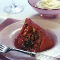 - Para servir, desenforme o pudim sobre uma travessa. Use o restante do suco de frutas para cobrir alguma parte do pudim que não esteja colorida. Sirva com creme de leite fresco batido, se desejar.