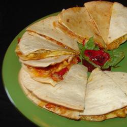 - Coloque as tortillas em um tabuleiro grande, uma ou duas por vez. Asse-as descobertas no forno preaquecido por 20 minutos. Ou, então, até o queijo derreter. Não deixe que se tornem crocantes demais. Retire-as do fogo. Antes de servi-las, corte-as em quatro com uma faca grande ou um cortador de pizza.