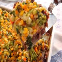 Na cobertura, refoguei um pouco de cebola e alho no azeite antes de acrescentar os legumes. E além da abobrinha e da cenoura, usei também vagem e brócolis.