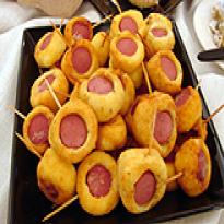 - Misture todos os ingredientes da massa até dar ponto para enrolar, em seguida coloque a salsicha dentro, corte em pedaços, espete um palito e frite em óleo quente.