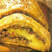 - Distribua o molho de carne e enrole a massa no formato de um rocambole, com a ajuda do papel-manteiga