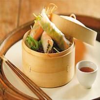 - Cortar os rolinhos na diagonal e servir com o molho.