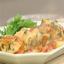 - Por cima de um filé de frango, coloque o tomate seco e o espinafre cozido