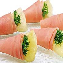 - Enrole as fatias de presunto como se fossem pequenos cones, de modo a envolver os triângulos de abacaxi