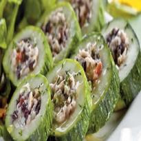 - Em uma saladeira distribua as rodelas de abobrinha com folhas verdes e cenoura ralada