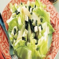 - Disponha as alfaces no fundo do prato e espalhe o queijo e as fatias de pêra