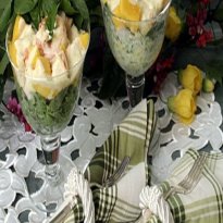 - Espalhar o molho na borda de uma taça alta e funda, disponha as folhas de alface picada, o agrião e adicionar uma colher de sopa do molho, juntar o camarão com as mangas e por cima espalhar mais um pouco do molho, reservar algumas folhas de agrião para enfeitar
