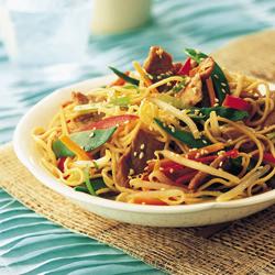 - Junte as tiras de porco e os sucos do cozimento ao macarrão misturado aos vegetais e mexa delicadamente. Distribua por 4 pratos, polvilhe com as sementes de gergelim torradas e sirva.
