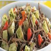 - Em uma saladeira, coloque a carne, o chuchu e tempere com azeite