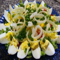 - Pique as folhas de alface em tiras grandes. Numa saladeira coloque o alface picado como se fosse um ninho. Coloque os tomates picados espalhados por cima, a manga picada no centro. Os ovos cozidos, corte em 4 fatias no sentido do comprimento e arrume nas bordas, coloque as rodelas de cebola por cima e salpique a cebolinha.