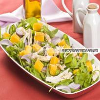 - Coloque a rúcula em uma saladeira, espalhe a cebola roxa, a manga picada e o frango e reserve