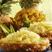 - Corte o abacaxi ao meio no sentido horizontal e retire a polpa sem furar a casca.