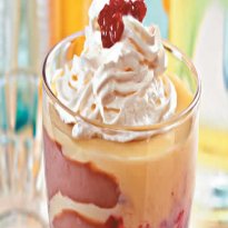 - Em taças individuais ou em um refratário, alterne camadas de brigadeiro, pudim e framboesa