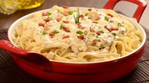 - Ainda com o fogo aceso na mesma frigideira acrescente o creme de leite e os champignons fatiados.