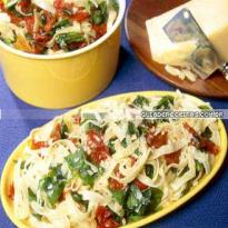 - Coloque as folhas de rúcula na tigela em que vai servir o talharim