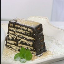 - Numa fôrma de bolo inglês forrada com plástico (18 cm X 6 cm) coloque uma camada de creme de chocolate (feito acima) e uma camada de biscoito maria