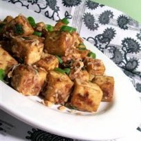 - Em uma frigideira esquente o azeite e o óleo de gergelim em fogo médio-alto. Abaixe o fogo. Acrescente a cebolinha e refogue-a durante 1 minuto. Adicione o tofu e cozinhe por mais 4 minutos, adicionando o molho de soja na metade do tempo. Delicadamente, misture a pasta de amendoim e o gengibre, tome cuidado para não desmanchar o tofu.