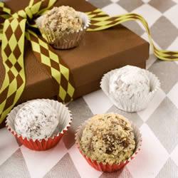 - Tire a massa de chocolate da geladeira. Faça as trufas em formato de bolinhas pequenas. Passe as bolinhas nas nozes moídas misturadas com açúcar ou somente no açúcar de confeiteiro. Guarde as trufas em um pote fechado. Sirva depois de uma semana guardada, pois o seu sabor vai ficar mais acentuado.