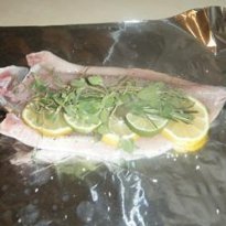 - Abra o peixe pela barriga e coloque o alho fatiado, as fatias de limão, o alecrim e o manjericão. Tempere com sal e pimenta. Embrulhe o peixe no papel alumínio e leve-o para à churrasqueira.
