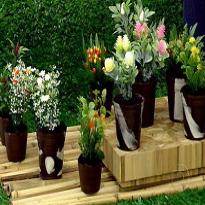 - Retire o copo plástico com uma tesoura e enfeite o vasinho com um bouquet pequeno de rosas artificiais.