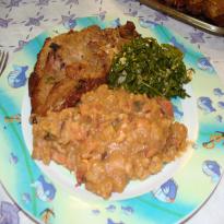 couve refogada (no óleo do bacon e bistequinha de porco; também pode ser ovo frito, torresmo… vai da preferência).